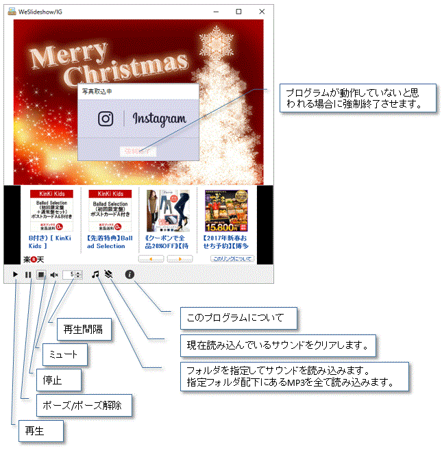 初めて再生するページは読み込みに時間がかかります。数分お待ちください。 インスタグラムのHTMLが変わるとスライドショーを生成中にプログラムが止まり、作成できません。この場合は本ソフトの新しいバージョンをダウンロードして下さい。