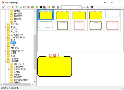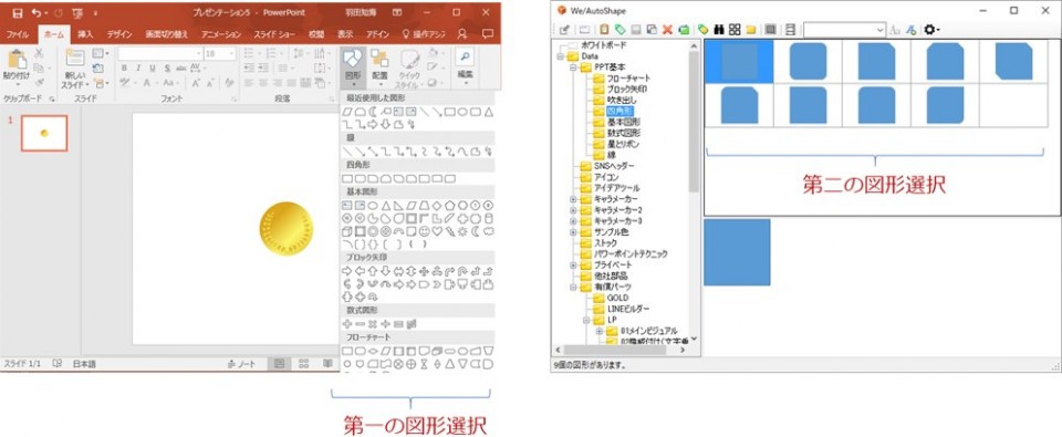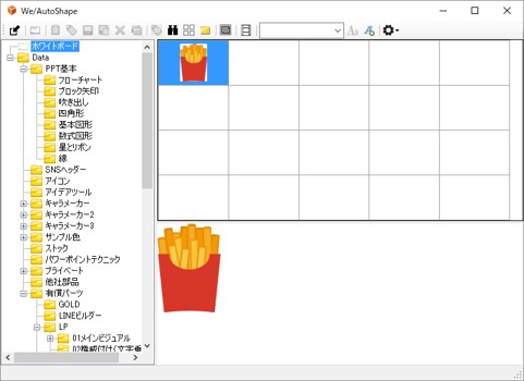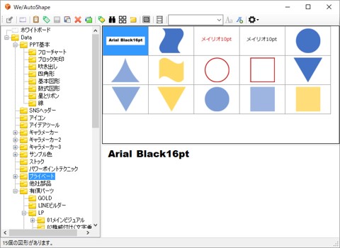 パワーポイントの図形選択にある図形はほぼ全てファイル化して収録してあるため、第二の図形選択として利用できます。