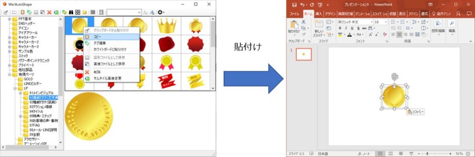 ・保存済み図形を使うには図形をコピーし、パワーポイントに貼り付けるだけ。